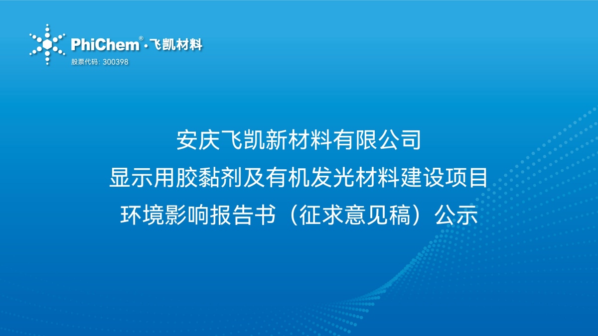 目前《安慶飛凱新材料有限公司顯示用膠黏劑及有機發(fā)光材料建設項目環(huán)境影響報告書》(征求意見稿)已形成,建設單位現(xiàn)將征求意見稿進行公示,并征求公眾意見。